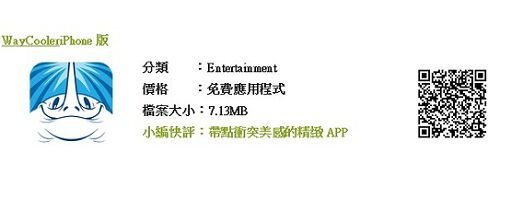 看的出來WayCooler的整體設計相當用心喔,首頁還是有動畫的哩~!簡單的上色卻很精緻!姐妹們就趕快去下載吧!