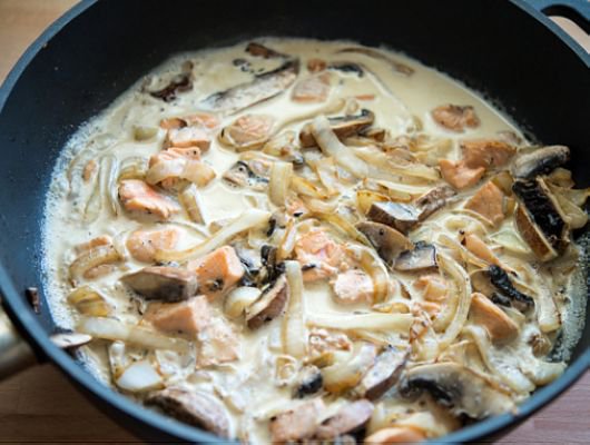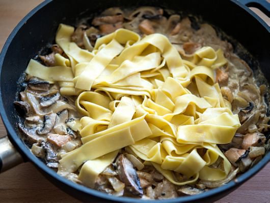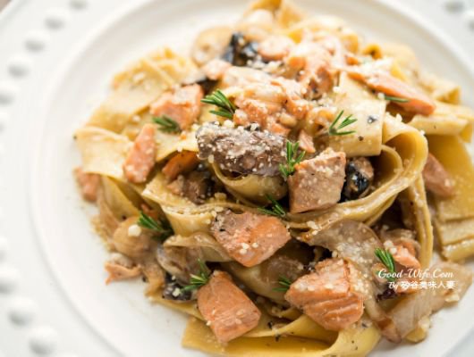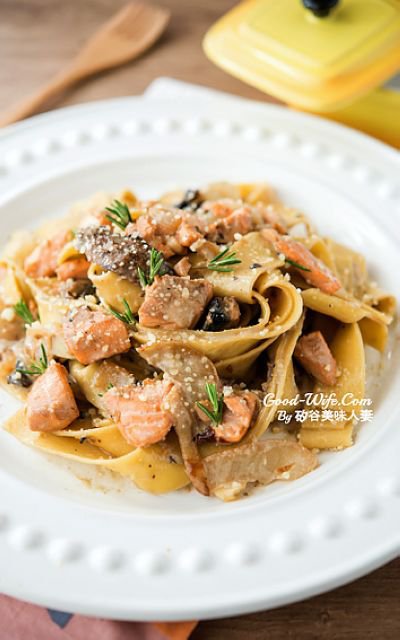 軟Q中帶有一點勁道的意大利寬麵裹覆著濃郁奶香鮭魚醬汁,厚實飽滿的波特菇有濃厚的蕈類迷人氣息,如果你會炒台式炒麵,就一定會做這道超簡單美味的鮭魚奶油寬麵唷 ^^