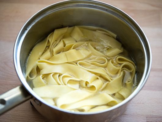 1. 熱水放入少許橄欖油和一小撮鹽,加入寬麵煮約12-15分鐘