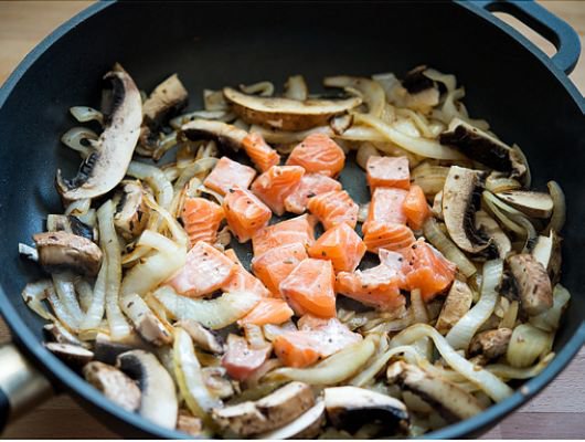 3. 加入鮭魚,波特菇炒至半熟,再淋上1/4杯白酒