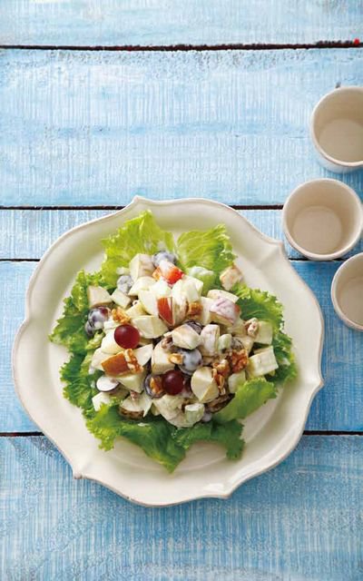 在料理碗中調和美乃滋、檸檬汁與蜂蜜後,加入蘋果塊、芹菜塊與核桃後拌勻,上桌前先在盤中鋪上生菜葉,再將拌好醬汁的沙拉放上即可。