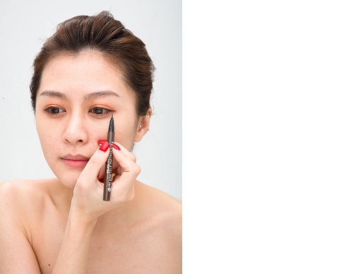 4.從眼睛中間開始畫,畫一條咖啡色眼線(產品2),前細後粗,眼尾平行拉長,約莫0.1公分即可。不要畫太長,自然就好。