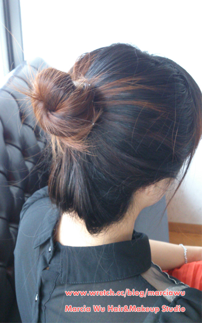 4.將丸子頭稍微整理後,套上大腸圈,就能遮蓋掉固定的小黑夾~超簡單的丸子頭就完成囉!
