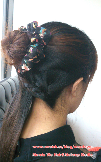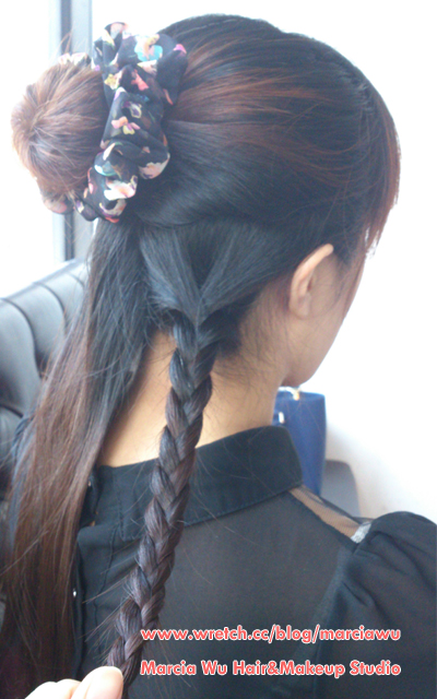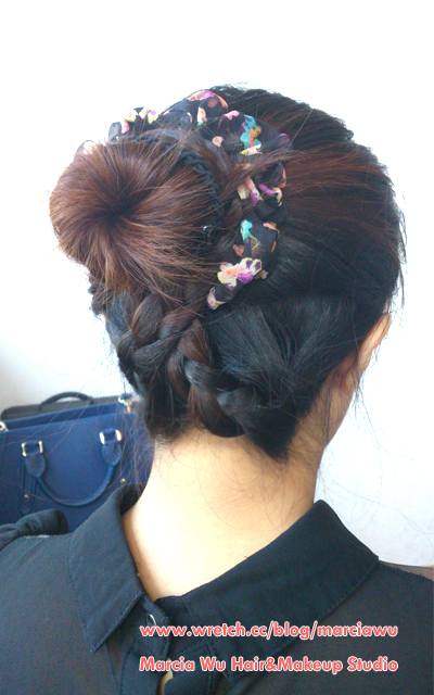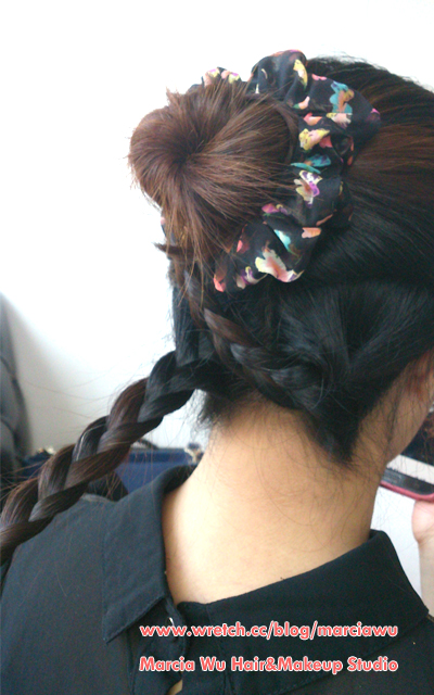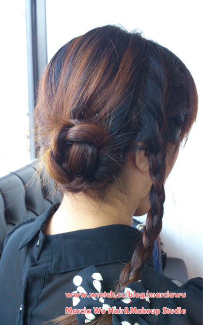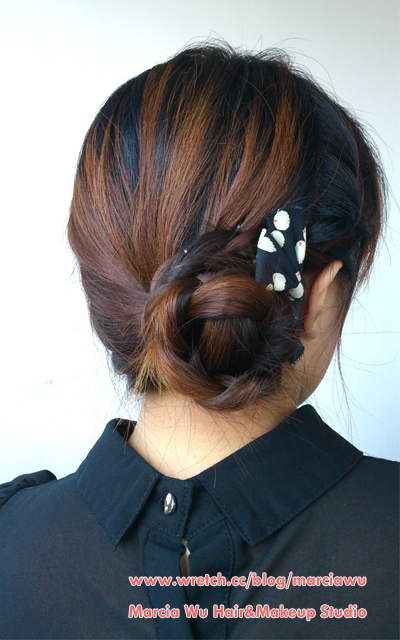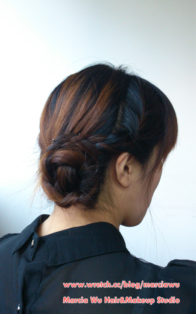 5.將下區右側髮束的三股辮往上繞,繞到上區的丸子頭上,並用小黑夾加以固定。