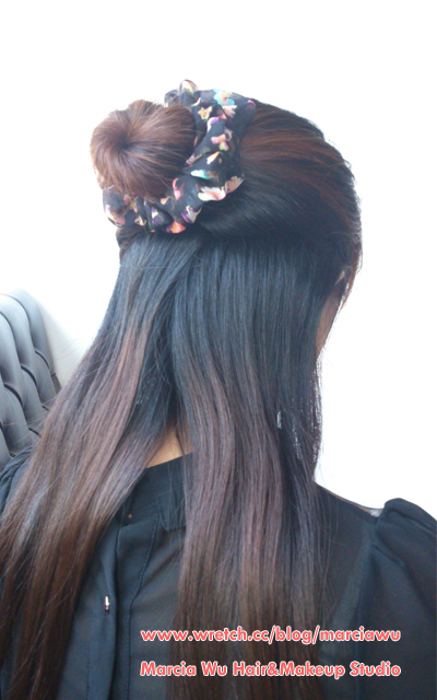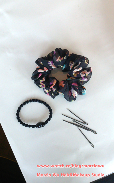◎所需工具:小黑夾數支、髮圈一個、大腸圈髮束一個