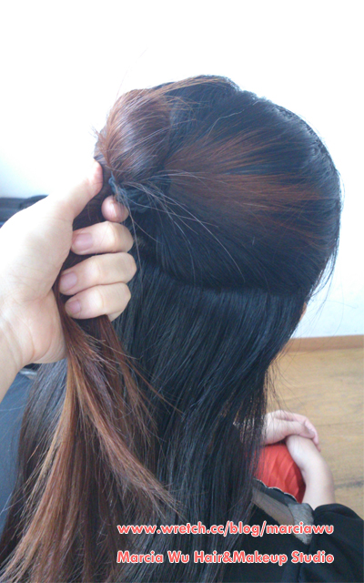 2.將上區髮束扭轉成一圈後,再以小黑夾固定。