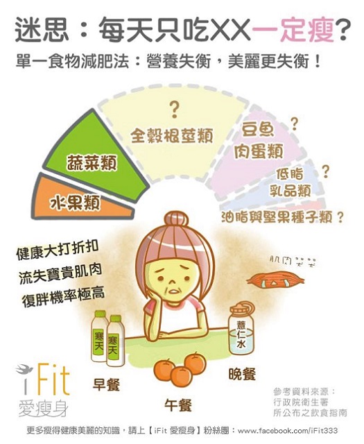 奉勸各位團員們,千萬不要長期實施單一食物減肥法,唯有依循「瘦身=脂肪↓+肌肉↑」法則,避開高熱量食物、保持充足均衡的營養,加上規律運動,才是正確長久的瘦身之道~