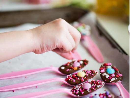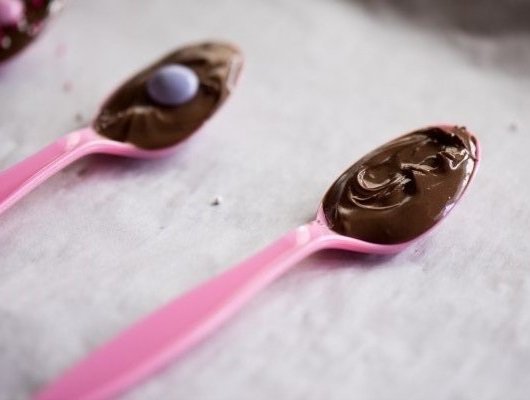 上週我們一起做的小點心是「繽紛巧克力湯匙」,做法和材料非常簡單。只要將巧克力磚放到碗中,用微波爐加熱到完全融化,將溫熱液狀的巧克力漿舀至彩色湯匙上,再撒上MM巧克力和一些巧克力糖片,就是繽紛亮麗又充滿童趣氛圍的巧克力湯匙。