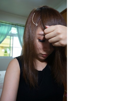 然後事先可以用瀏海貼,把整個髮流往左邊貼固定