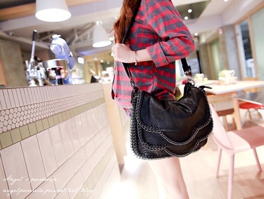 整個包包圍著的鍊子是造型~容量也滿大的,背起來就是 帥帥帥! 如果想要穿的非常帥氣、這個包絕對也可以很MATCH,其中有一片皮革是造型~