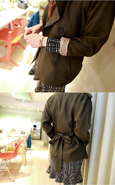 這件短版風衣的內裡超可愛呢! 點點的緞面布料,讓我傾心!!!還有繩子可以選擇要綁前或綁後~ 直接穿著的隨興~比較要提醒的,是他的顏色~~~比照片上淺一些、綠一些,是偏綠的墨綠色唷~
