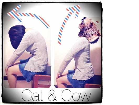 1.貓式牛式:首先雙腳併攏著地,兩手放在膝蓋上坐直挺,接著手輕打直頭低下去盡可能的彎腰駝背,然後手輕打直頭抬高盡可能的抬頭挺胸!
