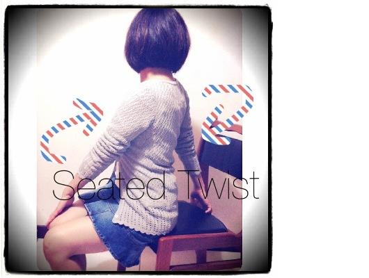2.坐著扭轉:接著吸氣坐挺,然後左手放在右膝上,整個上半身盡可能往右扭去看著你的右肩,一樣方式反方向做一遍!