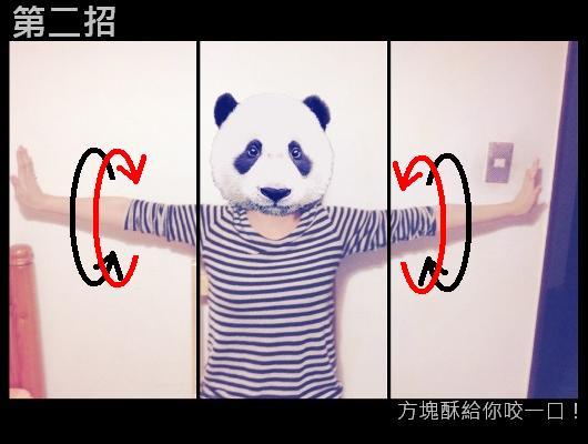 再來就是個運動到整隻手臂的運動惹~把雙手往兩側打直平舉,把手掌立起來,然後向後順時針轉個30圈,再來往前反時針轉個30圈
