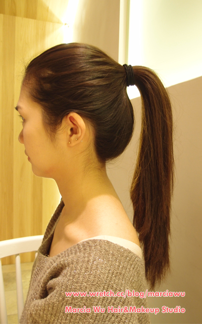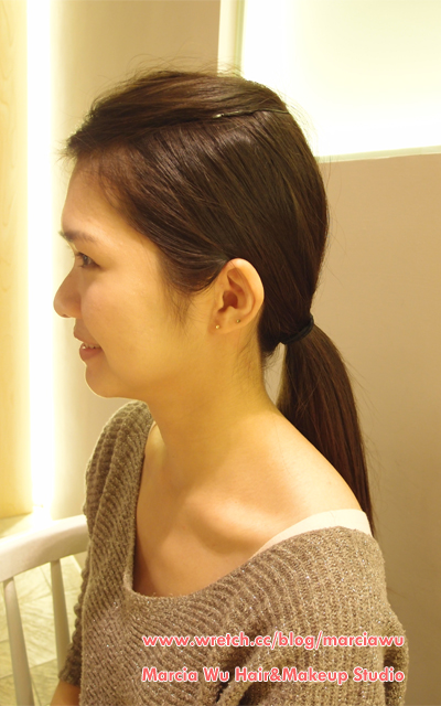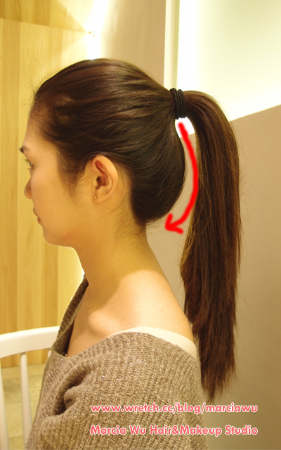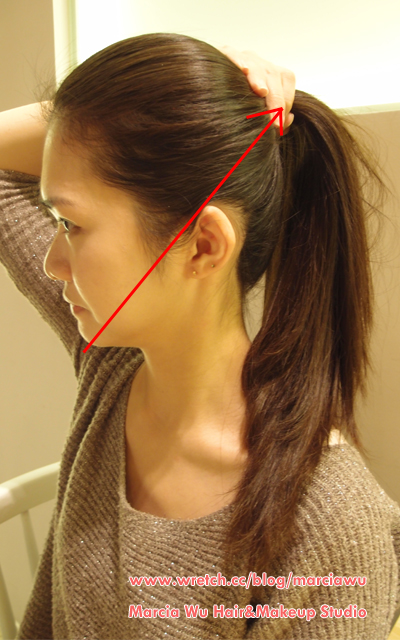 2.接著綁起高馬尾,高馬尾最好的黃金比例是:下巴─耳上─綁馬尾處,讓這三點可以連成一條線。