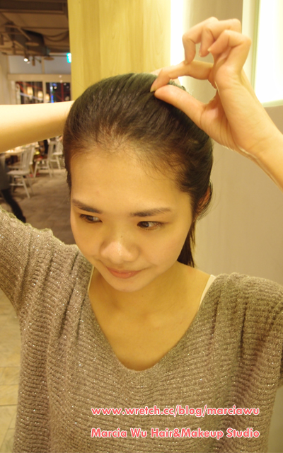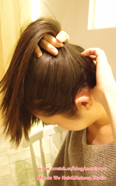 5.接著握緊後面馬尾,用手指調整正面前髮的澎度,稍微拉出一些蓬鬆感。