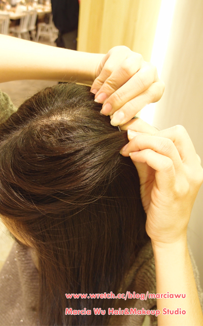 3.將劉海往後拉,以小黑夾固定於後腦勺頭頂。