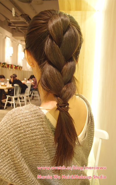 2.接著將此高馬尾編成鬆鬆的三股辮並收尾。
