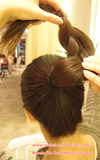 3.將剛剛綁好的高馬尾三股辮,在後腦勺盤成包包頭。