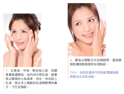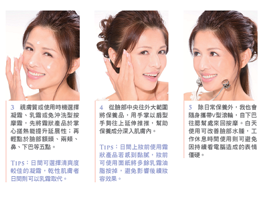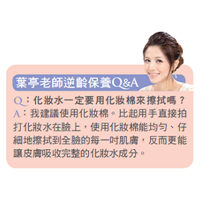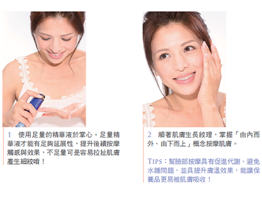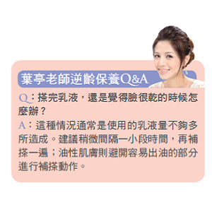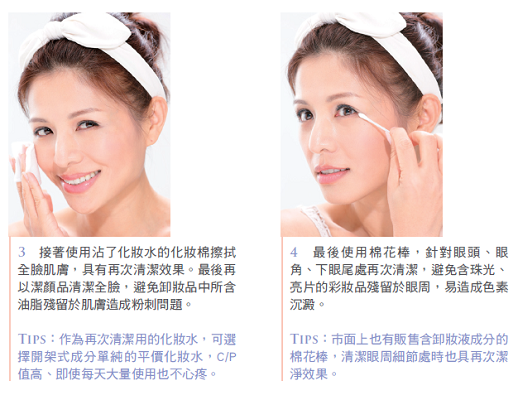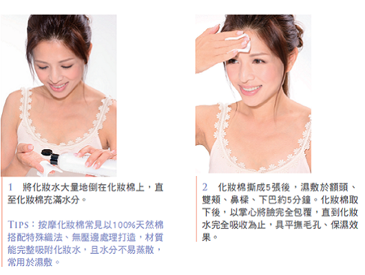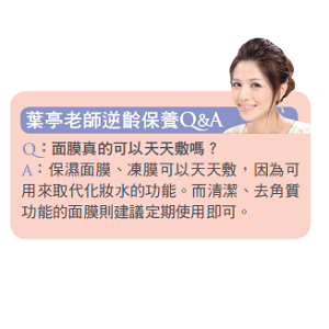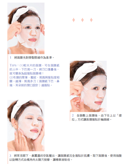 Tips:(1)高單價面膜的精華液不需洗淨即可進行後續保養,若價位極低的面膜由於不確定內含成分,建議敷完後先洗臉再搽保養品。(2)若購買膠囊紙面膜,將膠囊紙面膜浸於成分單純的化妝水中,待面膜紙吸滿水分後將其覆蓋於臉部,敷15分鐘後洗淨亦有鎮靜肌膚效果。