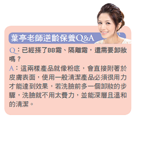 因工作關係幾乎天天需要上妝,彩妝與防曬品中含有多種原料,若不徹底卸妝,易造成毛孔阻塞,進而導致粉刺、痘痘問題。市面上卸妝產品質地多元,包含卸妝液、乳、凝露、霜與油等,針對彩妝濃度與膚質狀況選擇為不二法門。