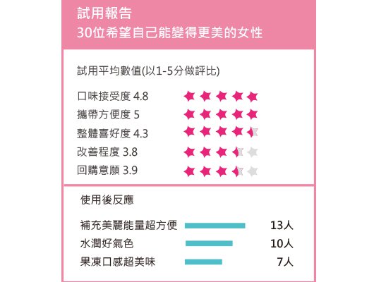 試用者Ashley:口感及口味都像享用可口的點心一樣,無負擔就能由內補充青春能量,是我最喜愛的原因。吃了一周後,真的比較水潤,是一款值得推薦給我的姊妹的好產品!
