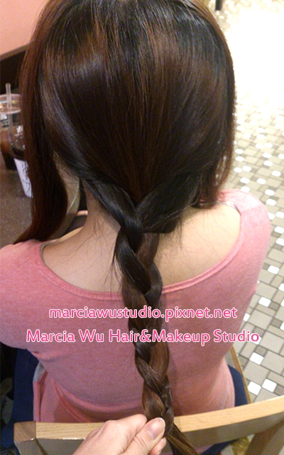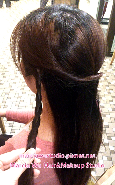6.三股辨編好後,一樣以小黑夾固定在後腦勺扭轉髮束的下緣。