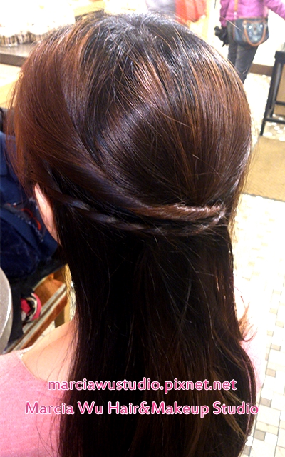4.取上半部的頭髮髮束做單股扭轉,並且以小黑夾固定在後腦勺頭髮的下緣處。
