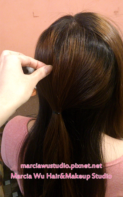2.接著分出後腦勺上半部的頭髮,並以黑色髮圈綁起固定。