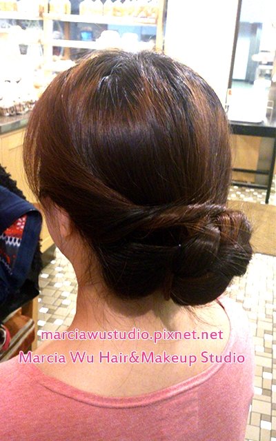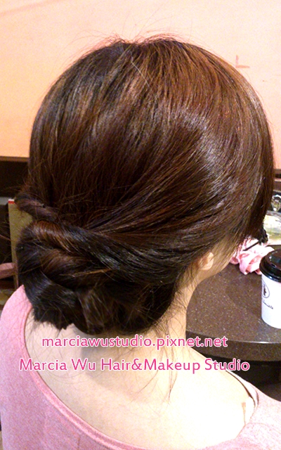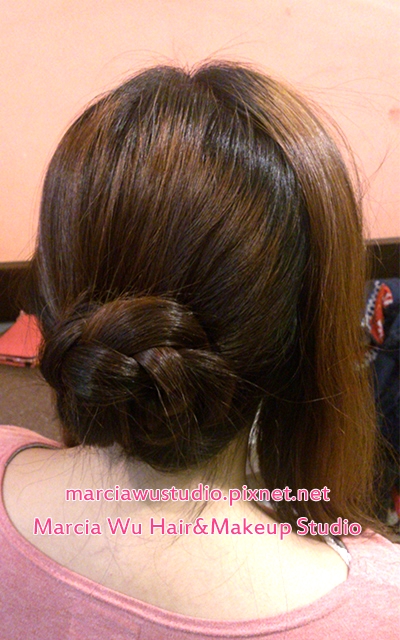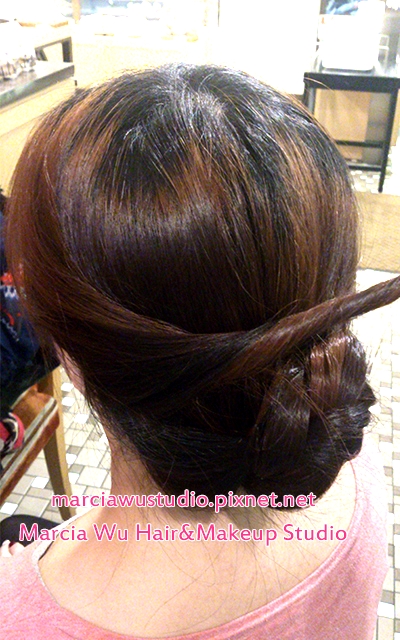 7.扭轉後的髮束以小黑夾固定,並盤繞在髮髻上。