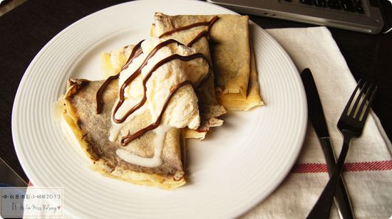 組合完成後,可以將組合好的可麗餅放回平底鍋用小火加熱個30秒,香蕉跟巧克力醬變溫熱的狀態,然後再挖個幾球冰淇淋放上去,緩緩融化的冰淇淋加上溫熱的香蕉巧克力醬,是冬日下午茶的好選擇喔~~~