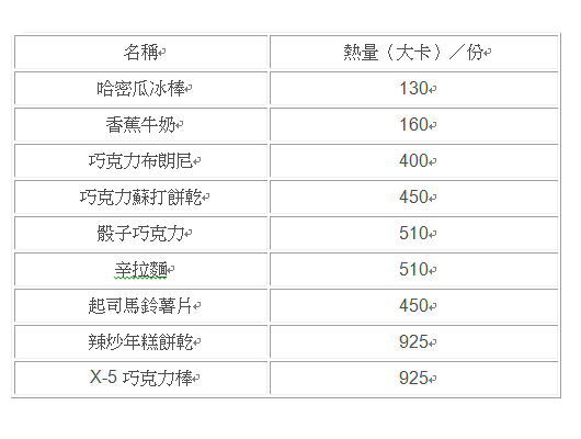 以熱量高達 925 kcal 「辣炒年糕餅乾」為例,由於體積小巧、吃起來甜中帶辣,容易讓人一口接一口,若常常無法克制、一口氣嗑下一大包,那麼「發胖」可就離你不遠囉!至於常見的 MARKET O 點心,雖然容量少、體積小,但也不能掉以輕心。例如小小一塊 20 公克的巧克力布朗尼,熱量即高達 100 kcal 。