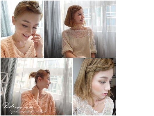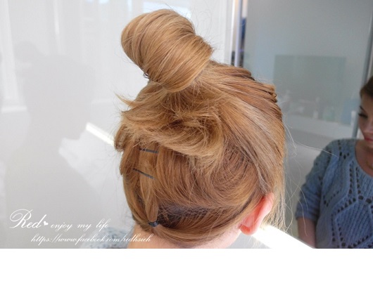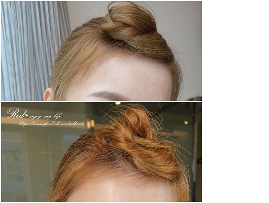 還順道把頭髮全部盤起來成了丸子頭兒,像我這樣及肩的短髮, 如果想把馬尾或丸子綁高一點後面的頭髮都會掉下來…所以那掉下來的啊紮頭髮就用小橡皮圈綁起來再往上夾就能收的乾乾淨淨^^+