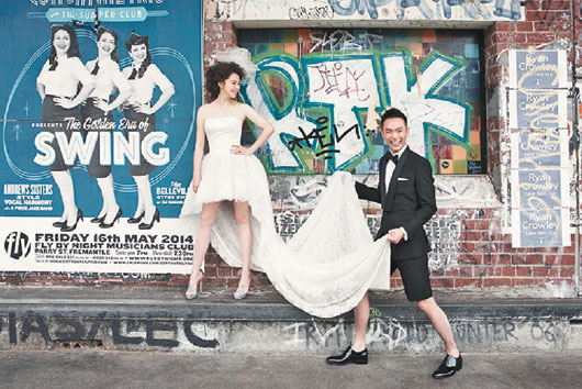 Vivian穿訂製白色婚紗,充滿古典美,另一件婚紗則搭配牛仔襯衫,風格休閒,還有件搖滾馬甲禮服,老公李雲峰還搞笑川短褲替她拉裙襬,模樣搞笑。