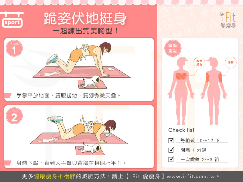 P.S. 無法一次做到位的人,可先做扶牆挺身,待肌力增加後再進行跪姿伏地挺身。