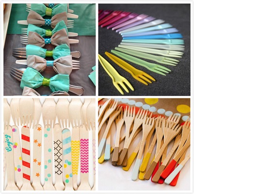 派對不免會用到一些免洗餐具,但免洗餐具跟精心布置的場地搭不起來怎麼辦!妳可以試試將配好顏色的餐具與餐巾紙用紙膠帶捲起來,像是蝴蝶結一樣既正式又可愛,也能輕鬆的用色筆將木質的免洗餐具加上喜歡的圖案,包準每個拿到手的賓客都會愛不釋手!