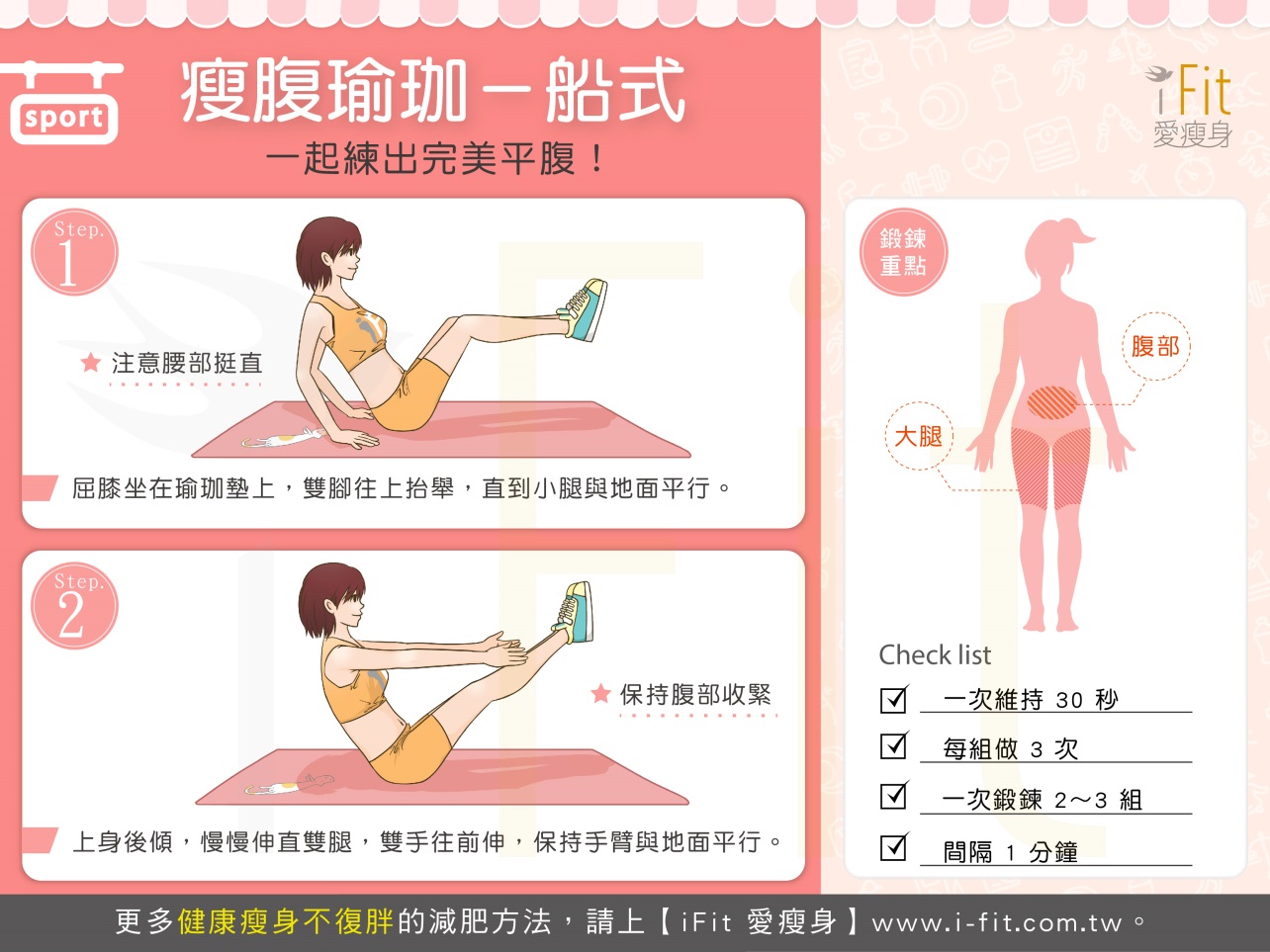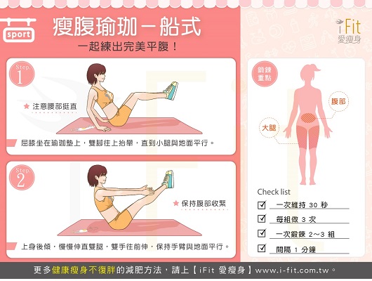 尤其穿上夏日的緊身 T-shirt,隨時都要繃緊肚皮,深怕一鬆懈就被看到肥美的三層肉;這樣下去可不行,快來做「船式瑜珈」,一起乘上瘦身號,開往腰瘦國度吧!