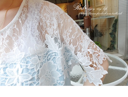 由細緻的網蕾絲和大朵的花瓣蕾絲作拚接, 下擺是舒服的水藍色完全美呆(*‘ v`*)