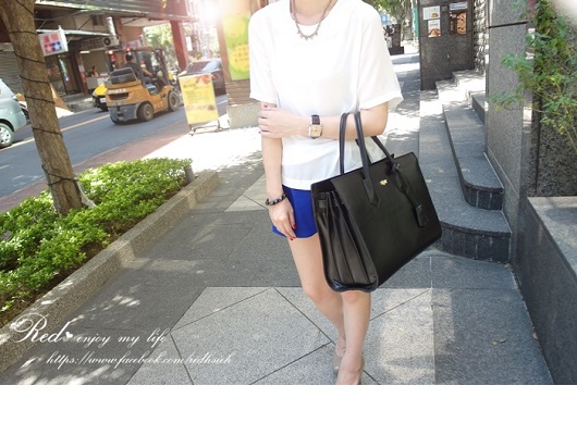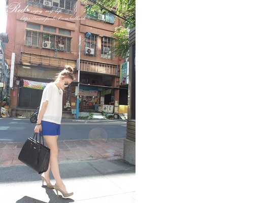 白色雪紡和寶藍短褲, 簡約的色塊極簡卻也有亮點+