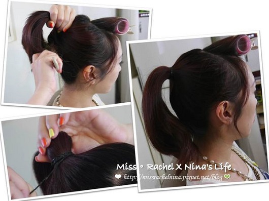 用造型髮捲先把瀏海捲起來放~等馬尾綁好時,她就會變澎澎的摟