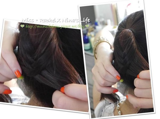 開始編麻花辮,會需要看鏡子調整一下髮帶的位置