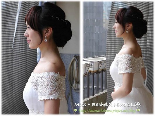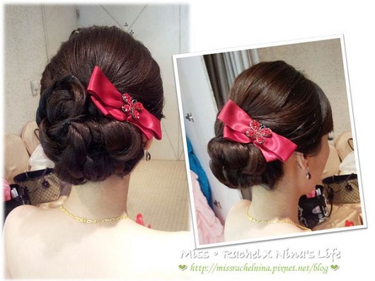 新娘盤髮,絕對要全面照顧到每一個角度,婚禮攝影或是朋友相機可是無所不在阿,累癱的婚禮過了3天後上FB,發現被tag的照片有好多張角度不滿意,或是拿到婚攝的照片或DVD一看……有些事就是無法重來…..