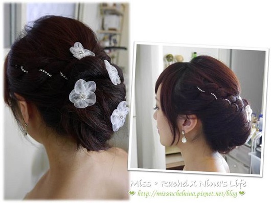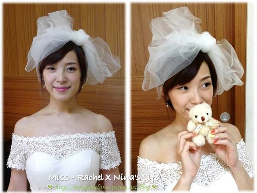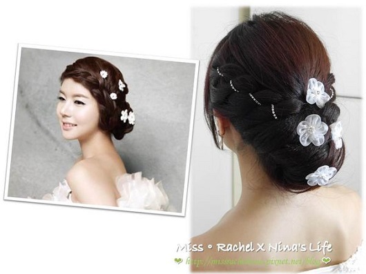 然後,現在韓式也很流行盤髮上面有一些小花朵,跟新娘身上的白紗非常的相襯,看看右邊照片,Nina將原本的盤髮上加上白紗小花,跟左邊韓國婚紗照相似度90%啦!