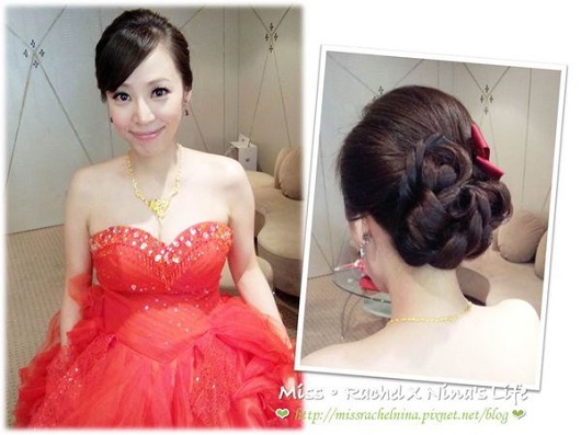 接下來Rachel出場~大紅新娘子的禮服!!走的是比較複雜些,華麗中看起來卻帶有典雅的盤髮風格