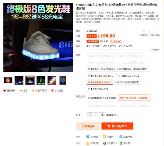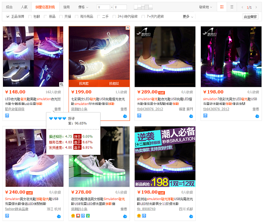 舉例,最近我FB上被粉絲詢問度最高的淘寶商品是這一雙今年秋冬紅遍美國、歐洲、亞洲的某知名LED發光鞋!我用發光鞋搜尋出賣家後,再用了”銷量”與”正品保證”交叉搜尋出這些店家,並以每個店家下面的標章可以做為選購參考,並以”找同款”與”找相似”功能比對各家價錢後,考量到只穿一季的情況,我最後會將人民幣200以下的賣家列為考慮,再進一步與賣家做線上聯繫詢問細節。