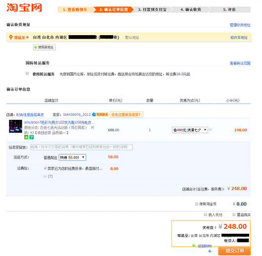 因為我只買這一件,所以我沒有選用轉運服務,如果是多件的話也會考慮使用,再全部集中一起寄到台灣。最後合併運費是人民幣248元,這個價錢我還能接受,即使是寄丟了,商品品質差也都還在我的忍受範圍之內。