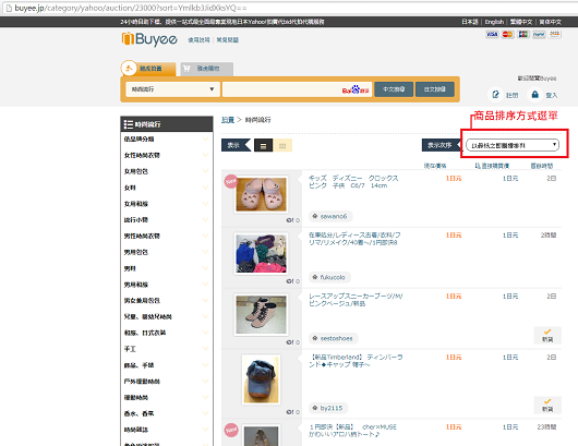到拍賣首頁最上方的"海外購買請按這裡",就會進入代購公司BUYEE的中文化服務網頁,然後就按照需求逐層搜尋即可,如果要找便宜貨,可以將右上的商品顯示方式改為"以最低即購價排列",就會看到許多從日幣1元起的便宜貨直到上千萬日幣的愛馬仕柏金包等所有商品,商品的排序設定,我通常會選從”最低即購價格”排列,不選“最低價格排列”是因為“最低價格排列”是指現在網友們的目前競標價不是最後賣價,如果我今天有要跟其他人競標我才會選。