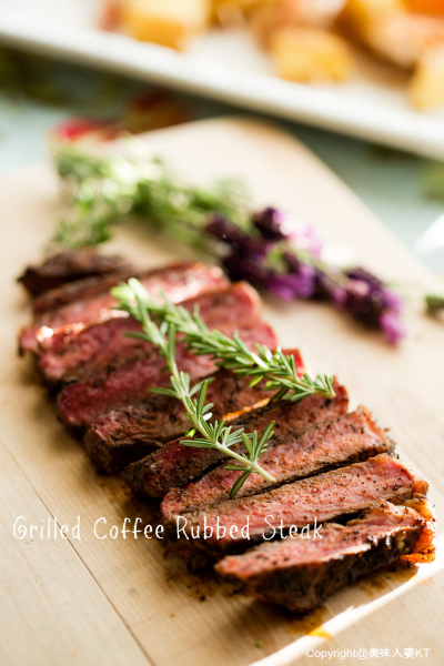 牛排淋上一 點橄欖油,再將香料粉均勻灑在牛排上輕輕按摩,讓咖啡香料與橄欖油和牛肉完美結合在一起,先用大火完美封住牛肉的鮮美肉汁,再移到弱火處讓牛肉慢慢的烘烤著,剛烤好的牛排靜置一下,讓牛肉纖維慢慢冷卻下來才能鎖住肉汁喲~