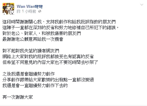 3個多月過去,彎彎今天在臉書表達心情,表示謝謝老公願意再給我一次機會,也對不起對她失望的讀者網友們,她已深刻反省,未來將持續努力創作。