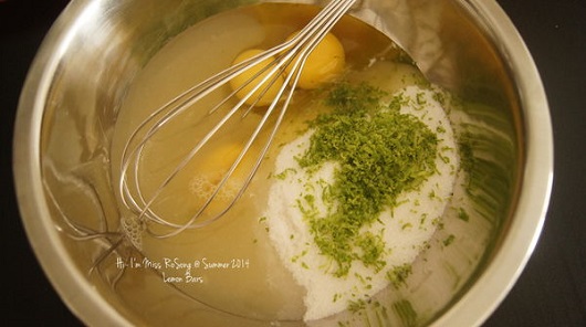 5. 將雞蛋,細砂糖,檸檬皮與檸檬汁攪打均勻。